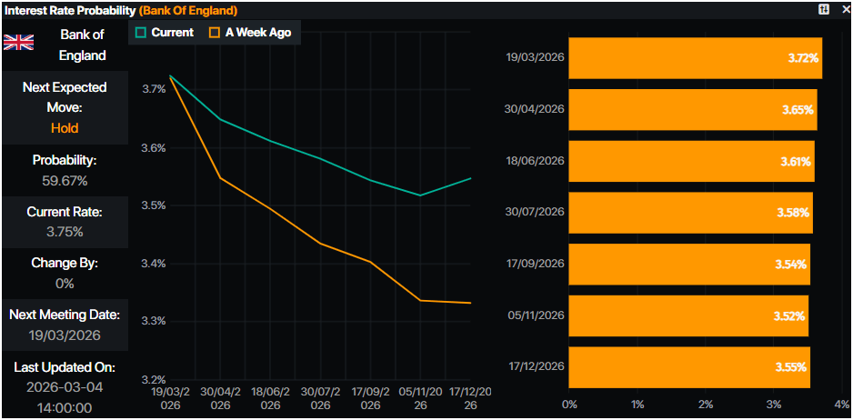 The aftermath of the Middle East conflict has money markets showing traders trimmed the odds for a rate cut by the Bank of England. The jump in oil prices pushed rate cut odds from 74% to just 25% as of writing, according to Prime Market Terminal data.